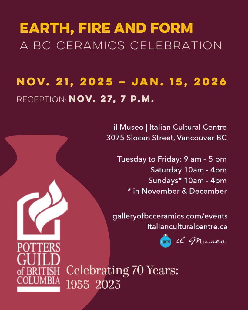 The Potters Guild of BC is celebrating their 70th Anniversary with this exhibition. For more information: PGBG Events .
